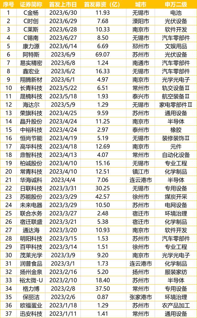 37只新股中,苏州7家,无锡7家,南京6家,常州5家,徐州3家,泰州、连云港、宿迁各2家,南通、镇江、扬州各1家。