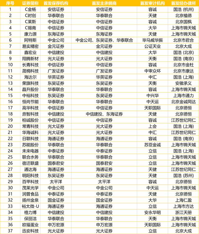 券商保荐承销方面,37只新股中,华泰联合6只,中信证券5只,光大证券4只,中信建投(1只与东海证券联合承销)、海通证券、东吴证券各3只,中泰证券、中金公司(1只与华泰联合、东吴证券联合承销)各2只,太平洋、申万宏源、金元证券、华英证券、国泰君安、国金证券、广发证券、东海证券、安信证券各1只。