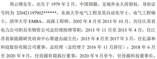 2015年8月至 2017 年 3 月,周云锋还任亿嘉和董事、总经理(总经理于 2016 年 11 月辞任),目前担任佳源科技董事长。