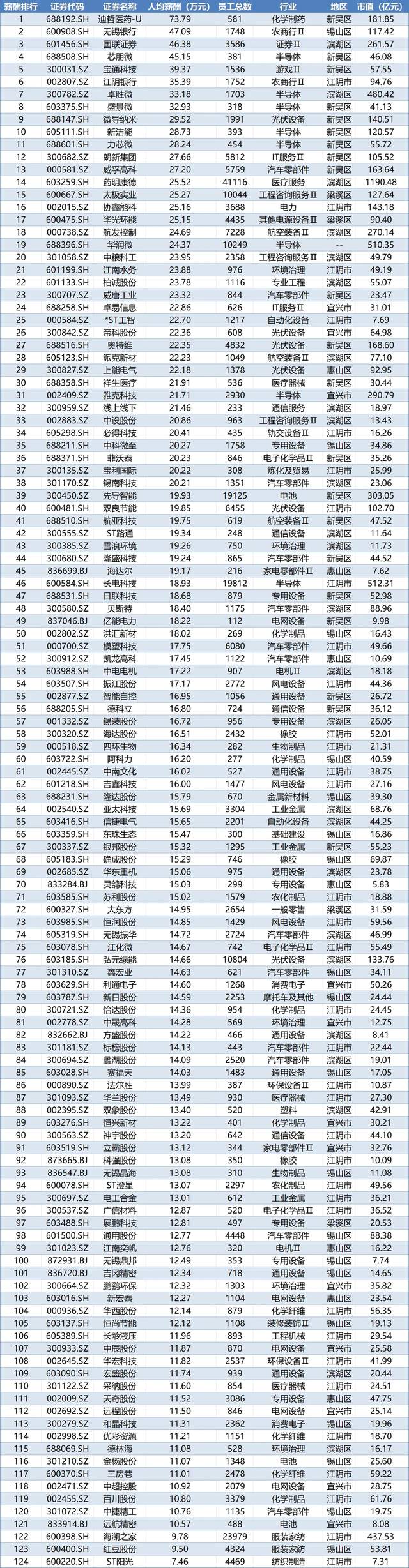 无锡上市公司员工薪酬排行