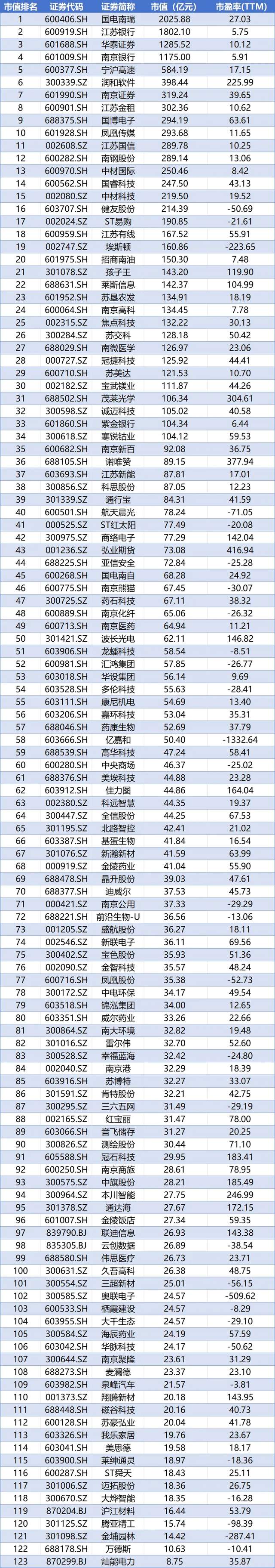 南京A股上市公司最新市值排名