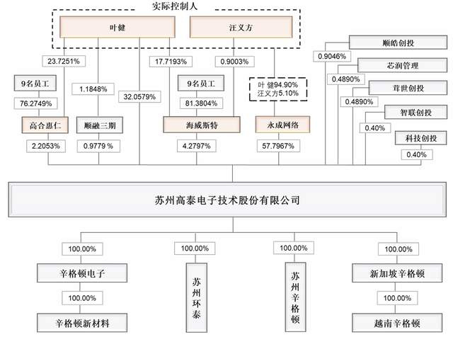 高泰电子实际控制人是叶健、汪义方夫妇,两人合计直接持有公司 32.0579%的股权,通过永成网络间接持有公司 57.7967%的股权,通过海威斯特控制公司4.2797%的股权,通过高合惠仁控制公 司 2.2053%的股权,合计控制公司 96.3396%的股权。