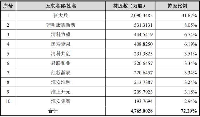 张大兵直接持有公司 31.67%股份,为公司的控股股东。另外,张大兵通过淮安集智、淮安集才和淮安集礼分别控制公司 2.94%、2.67%、1.30%股份,合计控制公司38.58%股份。
