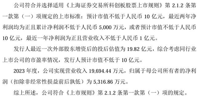 傲拓科技选择的是科创板第一套上市标准,公司最近一次外部融资的投后估值是19.82亿元。