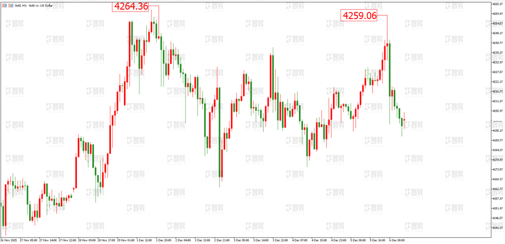 技术面:黄金上周维持震荡走势,上周五(12月5日)冲高快速回落,后续若跌破4180美元的关键支撑,则将形成双顶结构,后续恐将深回调至4120美元一线。