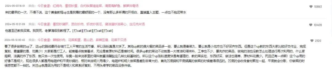 5月4日,UP主-阿蔡美食雕刻发布的一条“四菜一汤教程”,截至目前,该作品共斩获895.2w播放量、87.9w点赞数,综合互动率高达13.85%,可见用户对视频的喜爱程度之高。