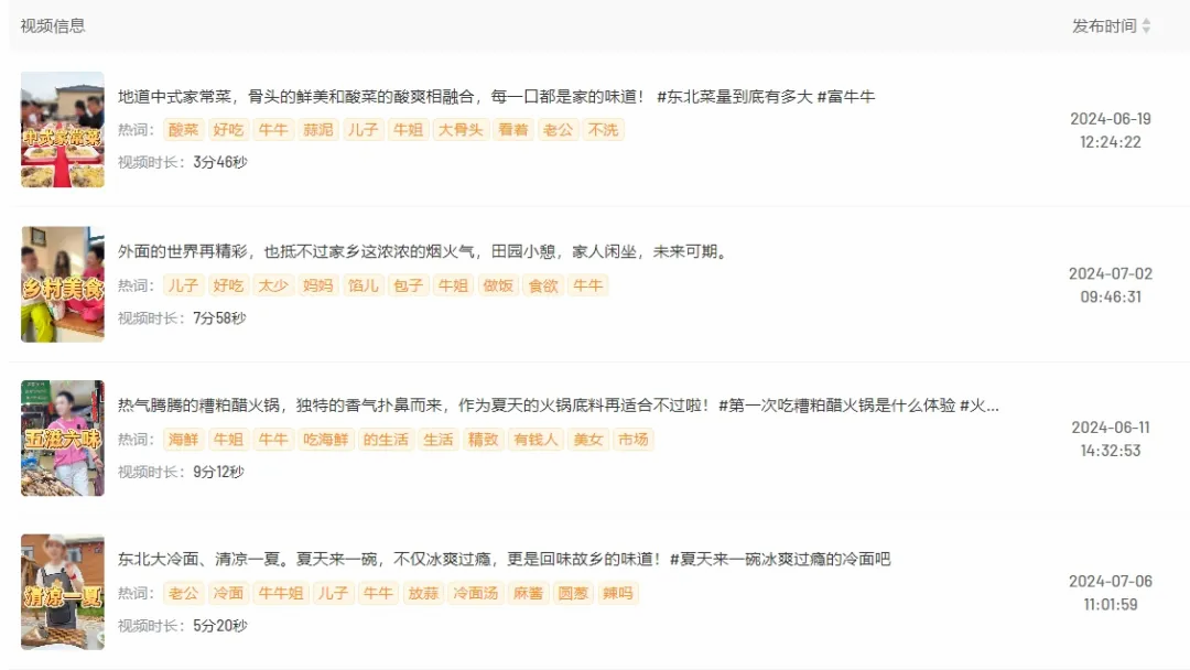 观察以往发布的视频,可以发现她的视频风格与直播带货是高度垂直吻合,用vlog的形式记录日常生活的烟火气,以家常菜、海鲜、美食为主,成功建立一个“温馨真实”的家庭女性人设,进而反哺直播间。