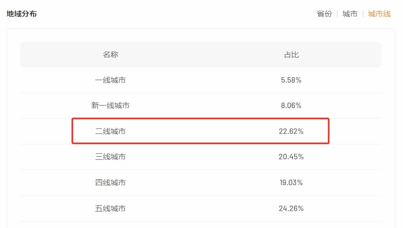 另外在@富牛牛的账号粉丝中,高线城市用户比例有着不小的数量,其中二线城市占比仅次于五线城市,达到22.62%。这部分人群接触事物面更广,消费判断更清晰,且有较高的消费挖掘空间。