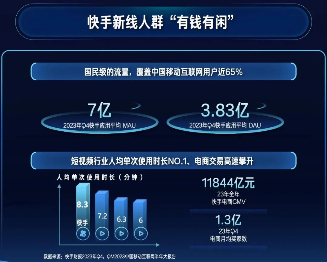 另一方面,据2023年快手财报显示,第四季度平台用户规模首次突破7亿,实现了对新线城市“有钱有闲”群体更广范围的覆盖。同时电商月均买家数同期突破1.3亿,也使得快手电商成为各类商家开拓新增量的理想选择。