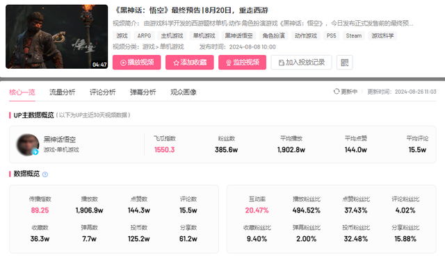 当8月8日,官方账号-黑神话悟空发布最终预告,就登上B站热门第一。截至目前,这支预告片为账号累积了1906.9万的超高播放,互动率高达20.47%,其中点赞数破140万,作品发布后涨粉56w。