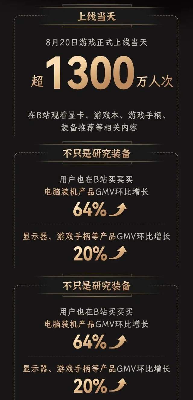 据官方数据披露,《黑神话:悟空》走红,B站数码3C产品消费迎来大爆发。上线当天,超1300万人次在B站观看显卡、游戏本、游戏手柄、装备推荐等相关内容。