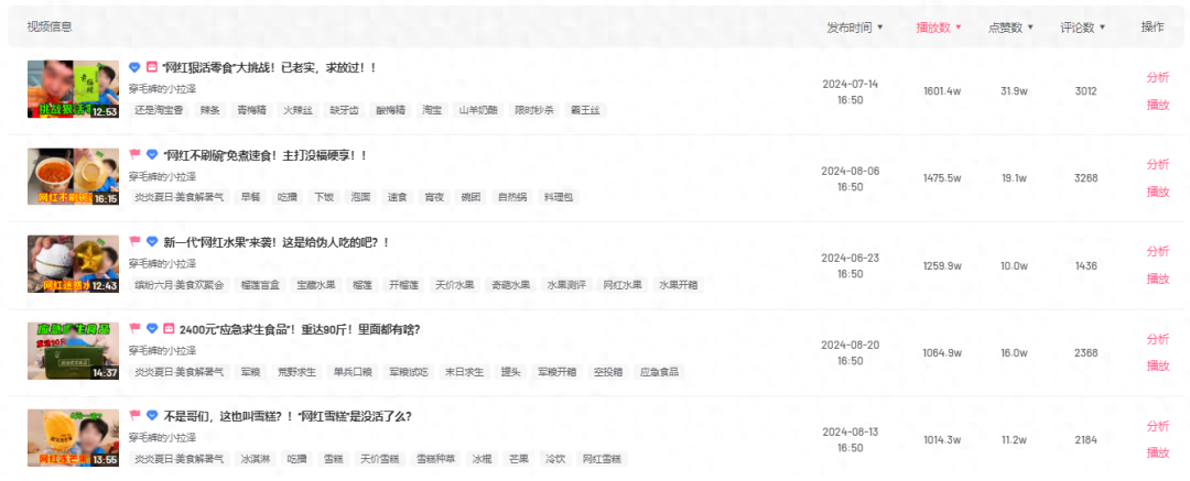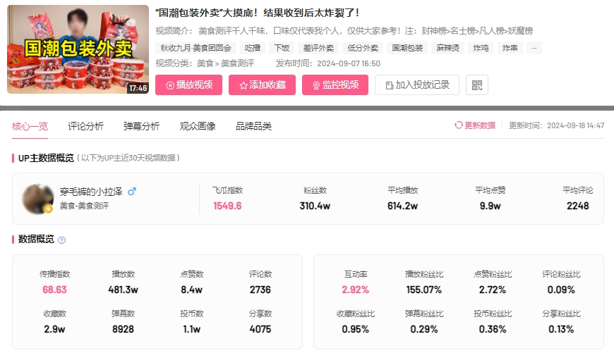 近期,UP主发布的美食测评视频持续火热,频繁冲上热门视频榜前列,其中作品播放量最高已累计1601.4w,可见其内容的强烈吸引力和高人气。
