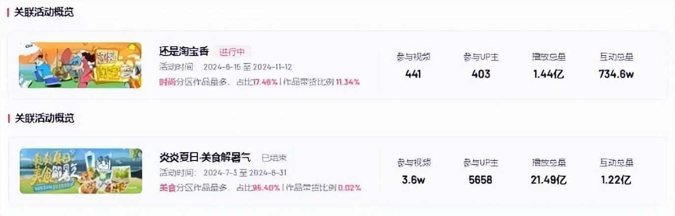 为了进一步提升作品的流量与影响力,UP主基于自身账号定位,将创作的内容作品关联各类热门活动中,如“还是淘宝香”活动、“炎炎夏日·美食解暑气”活动等等。通过平台的流量倾斜与资源加持,不断为作品加码曝光。