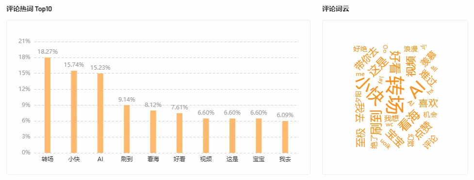 这如此丝滑无缝的转场效果,叠加最后海面的氛围感,网友们纷纷赞不绝口。从评论热词中可以看到,转场、小块、好看等关键词占比较高,可见视频内容引起了用户极大的兴趣。