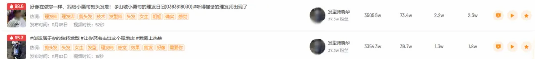 视频中,同为理发师的达人-山城小栗旬也来到怀化线下门店打卡,和理发师晓华互相剪发,这支作品截至目前已斩获了3505.5w播放量。