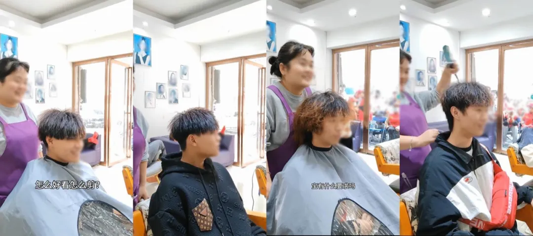 在达人的大多视频作品中,都没有过多的言语,就是简单的听顾客需求、开剪、吹好的一套流程。