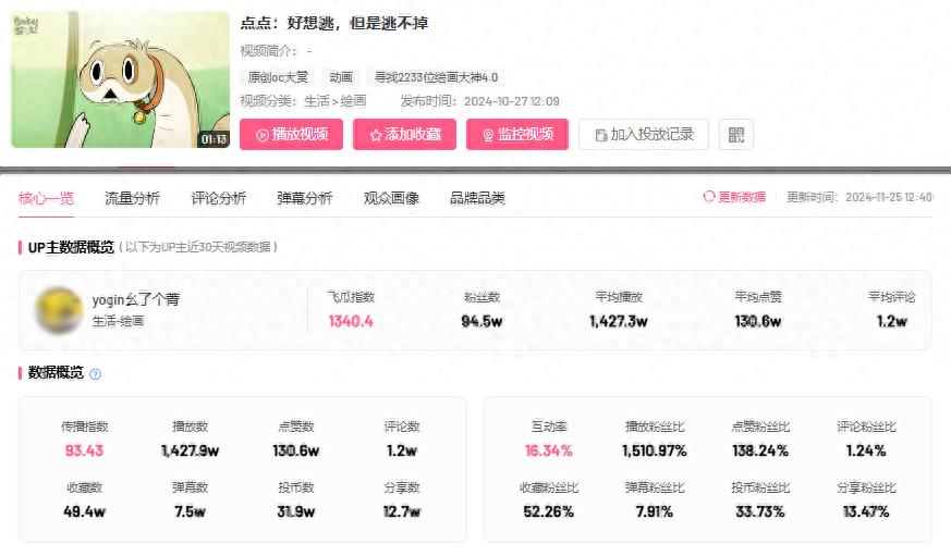 近期发布的《点点:好想逃,但是逃不掉》作品更是一举拿下1427.9万的超高播放,爆赞130.6万,且用户热情反馈,互动率高达16.34%,可见小狗蛇的极高人气和受欢迎程度。