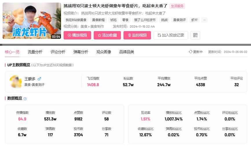 11月15日,UP主-王蒙多发布的《挑战用10只波士顿大龙虾做童年零食虾片,吃起来太香了》恰饭作品,截至目前累计播放531.3w,创下11倍的播粉比,快速登上爆款视频榜。