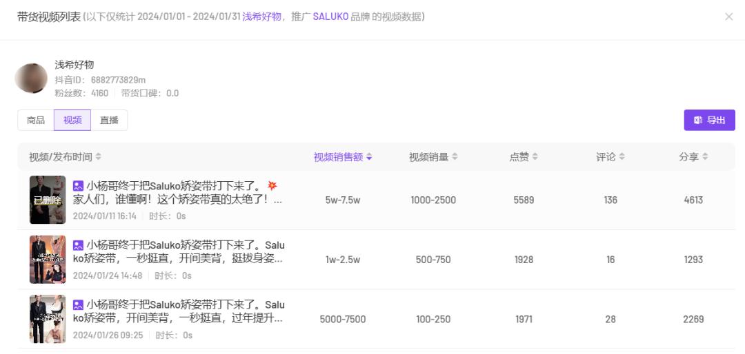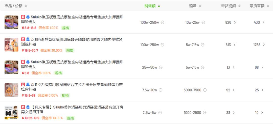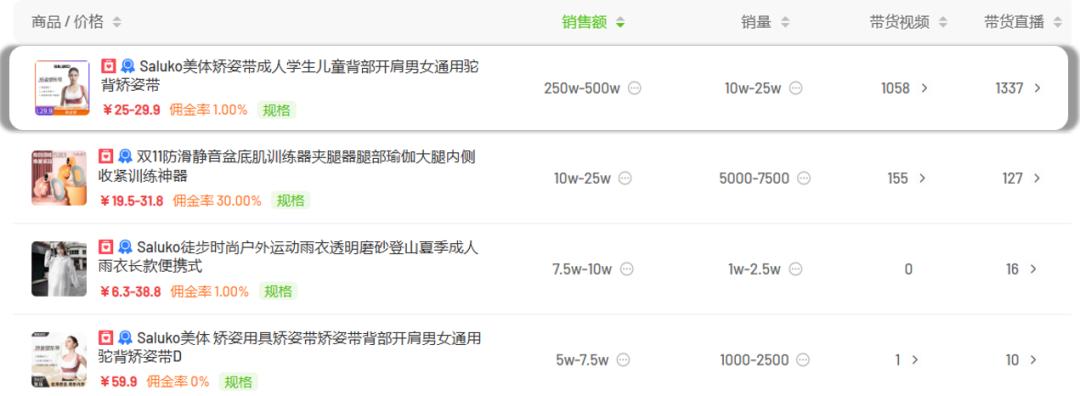 在24年上半年,「SALUKO」主要推广其下的“美体矫正带”,关联的带货视频、带货直播均达上千个,销售额排名TOP1的“矫正带”单品占品牌24年h1的销售额近9成。