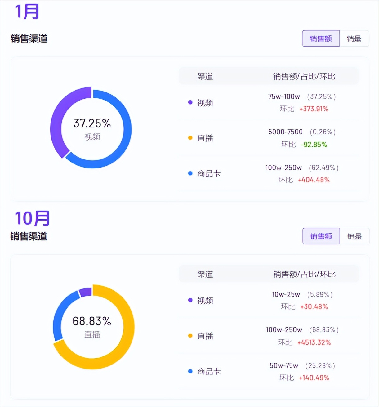 对比1月和10月的销售构成分析,10月的销售额中带货直播的销售额贡献占比近7成。