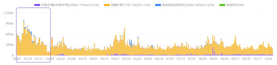 与此同时,我们通过关键词对“矫正带”这一细分品类进行分析,可见该品类在今年的销售增长显著,24年至今的销售额达到7.5亿以上,环比23年增长439.03%,且同样是1月的销售成绩凸显。