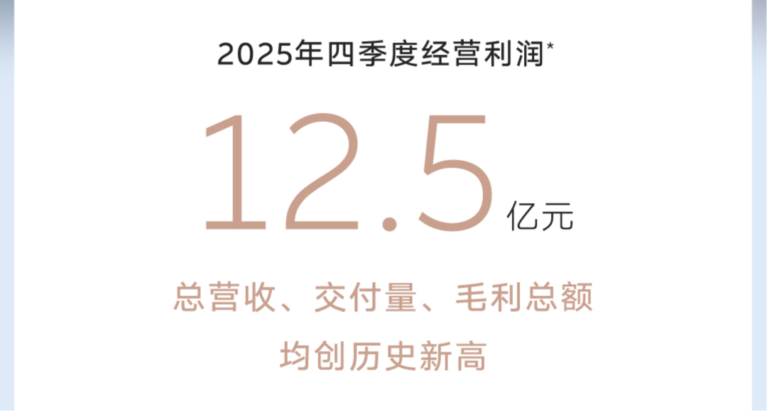 蔚来近日发布的2025年第四季度及全年财务业绩报告显示,总营收、交付量和毛利总额等均创历史新高,尤其是2025年四季度扣除股权激励后的营业利润为12.5亿元,是蔚来首次季度盈利。