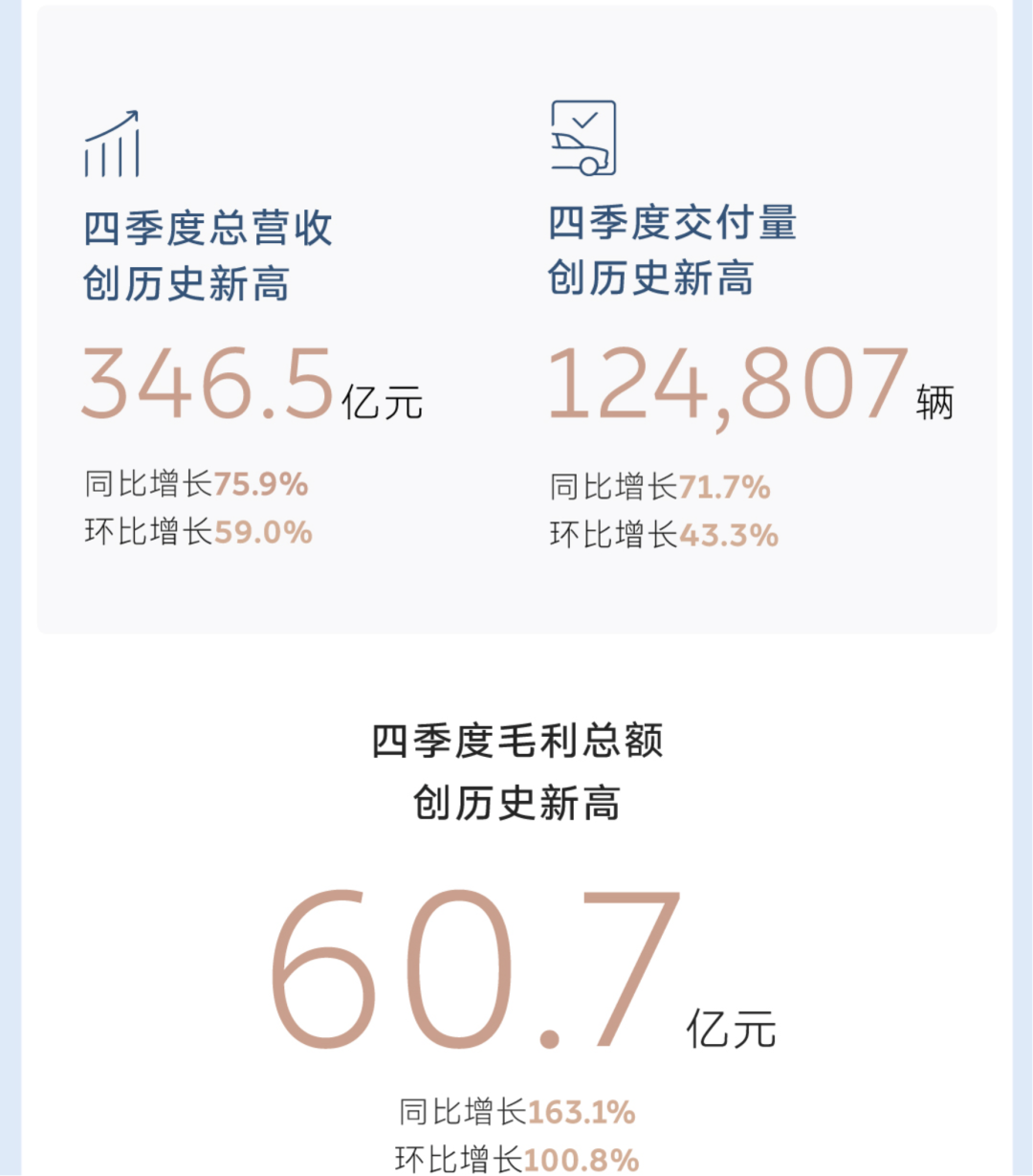 伴随着营收的跨越式增长,蔚来的交付规模也迎来了里程碑式的突破,四季度交付量为124807辆,同比飙升71.7%,环比大涨43.3%,同样创下了历史单季交付量的新高。