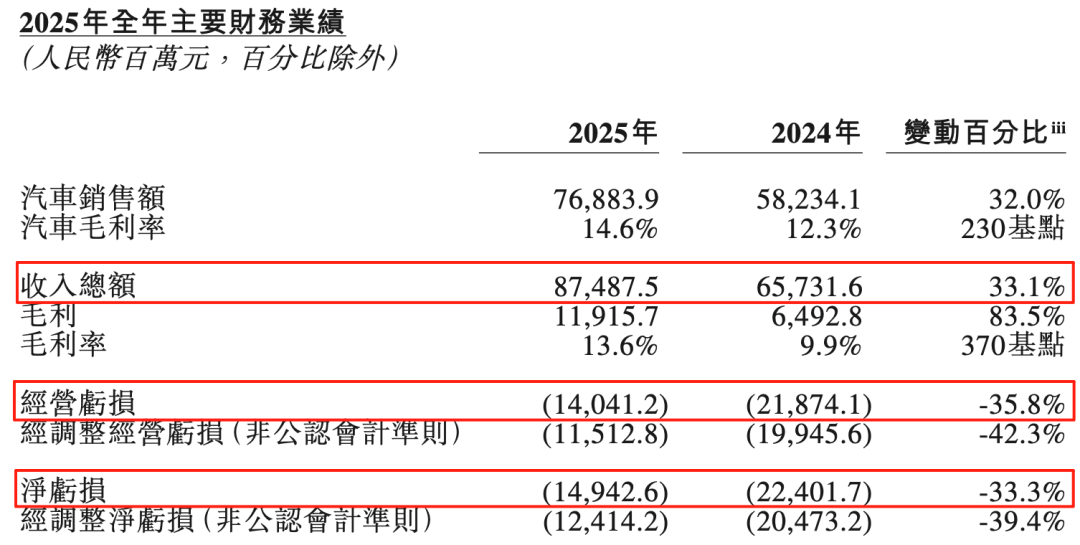 2025年全年,蔚来共交付新车32.6万辆,同比增长46.9%;全年的收入总额为874.88亿元,同比增长33.1%;净亏损149.43亿元,同比收窄33.3%;经营亏损为140.41亿元,同比收窄35.8%。