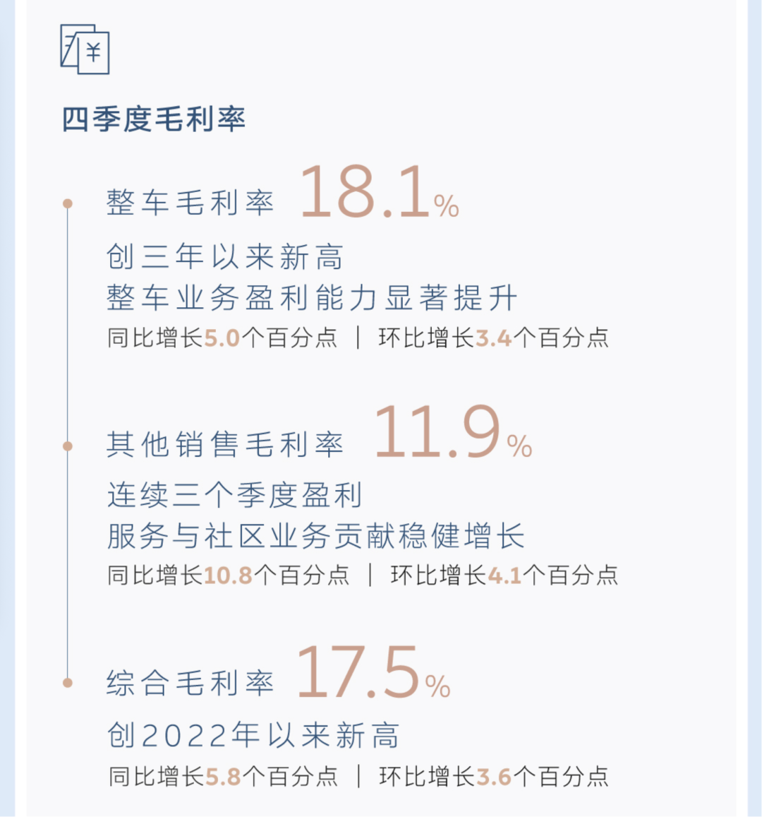 回头看财报,蔚来2025年四季度交付了12.48万辆,并未达到15万的理论阈值,再结合李斌公开表示的“四季度没有新车、没有研发费,花钱的事第三季度都搞完了(通常在四季度举办的蔚来日活动放在了三季度)”,可以看出,蔚来的盈利更多依赖于毛利率的提升(整车毛利18.1%)和费用的超常规缩减,而非规模效应的自然溢出。