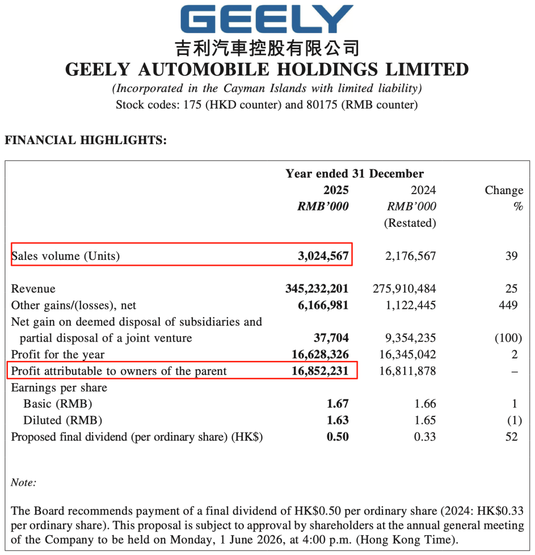 2025年吉利汽车在销量和营收上,都实现了同比双位数的增长,卖了302.5万辆新车,同比增速达39%,实现营收3452.32亿元,同比增长43.73%。