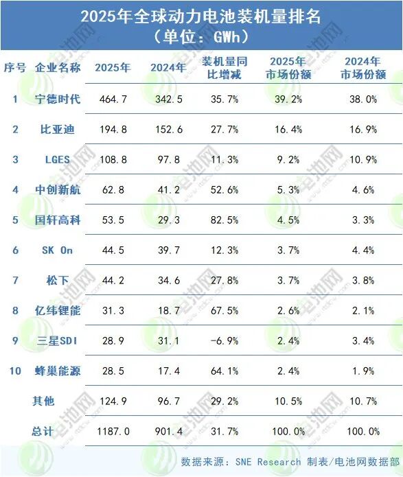 再看宁德时代。2025年,宁德时代全球动力电池装车量达464.7GWh,同比增长35.7%,市占率39.2%,连续九年位居全球第一。根据中国汽车动力电池产业创新联盟统计,宁德时代2025年国内市占率更是达到43.42%。