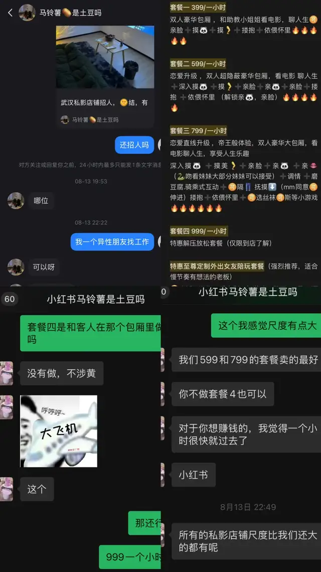 然而,后续跟进调查显示,这些问题并未彻底消失。涉黄招募笔记依然存在,名为“马铃薯是土豆吗”的博主发布发布招募私影工作的笔记,私信后被导流之第三方平台便出示了一份套餐价格表,并且提供打飞机和外出的服务,该博主直言:小红书所有的私影店铺尺度比我们还大的都有。