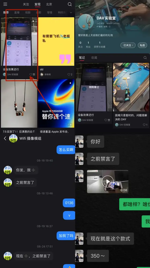 而针孔摄像头同样存在,在小红书发现页,就有名为“DVA实验室”的博主发布针孔摄像头的视频。另一个名为“Wifi摄像模组的则是导流在第三方平台进行350元一个的价格进行售卖。