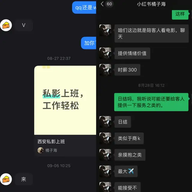 小红书另一个名为“橘子海”的博主,同样是发布私影招募后导流至第三方平台,也是包含打飞机等擦边涉黄服务。