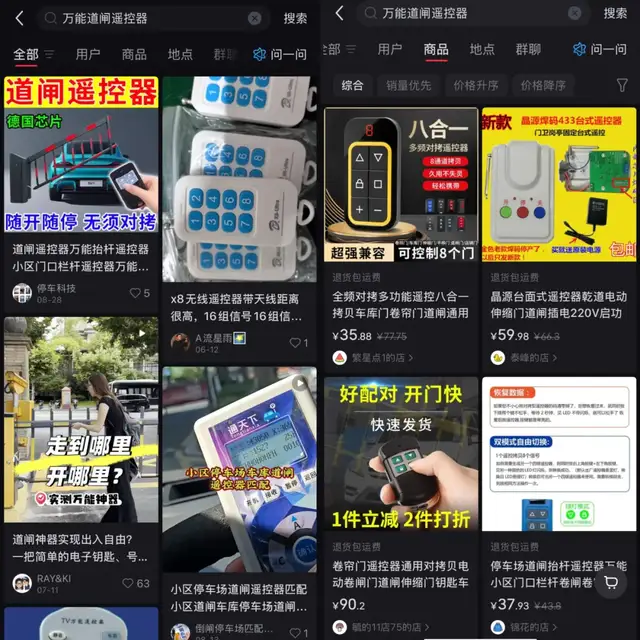 而万能道闸遥控器搜索关键字,不仅大量博主发布教学宣传笔记,商品页面依然大量商家售卖。