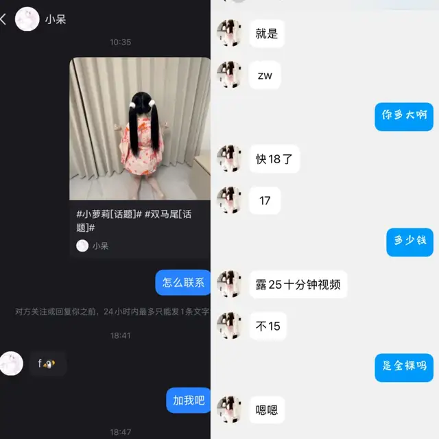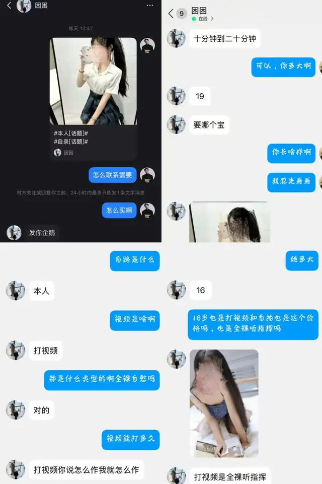 随即联系一位名为“困困”的博主,交谈后该博主随即引流至第三方平台进行交易:该博主表示:自录为本人全裸自慰视频38元、打视频随意指挥48元。值得注意的是,该博主不仅自己才19岁,并且还表示有一个16岁的妹妹同样可以提供上述全裸听指挥的服务内容。