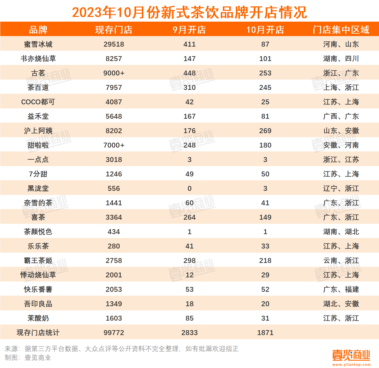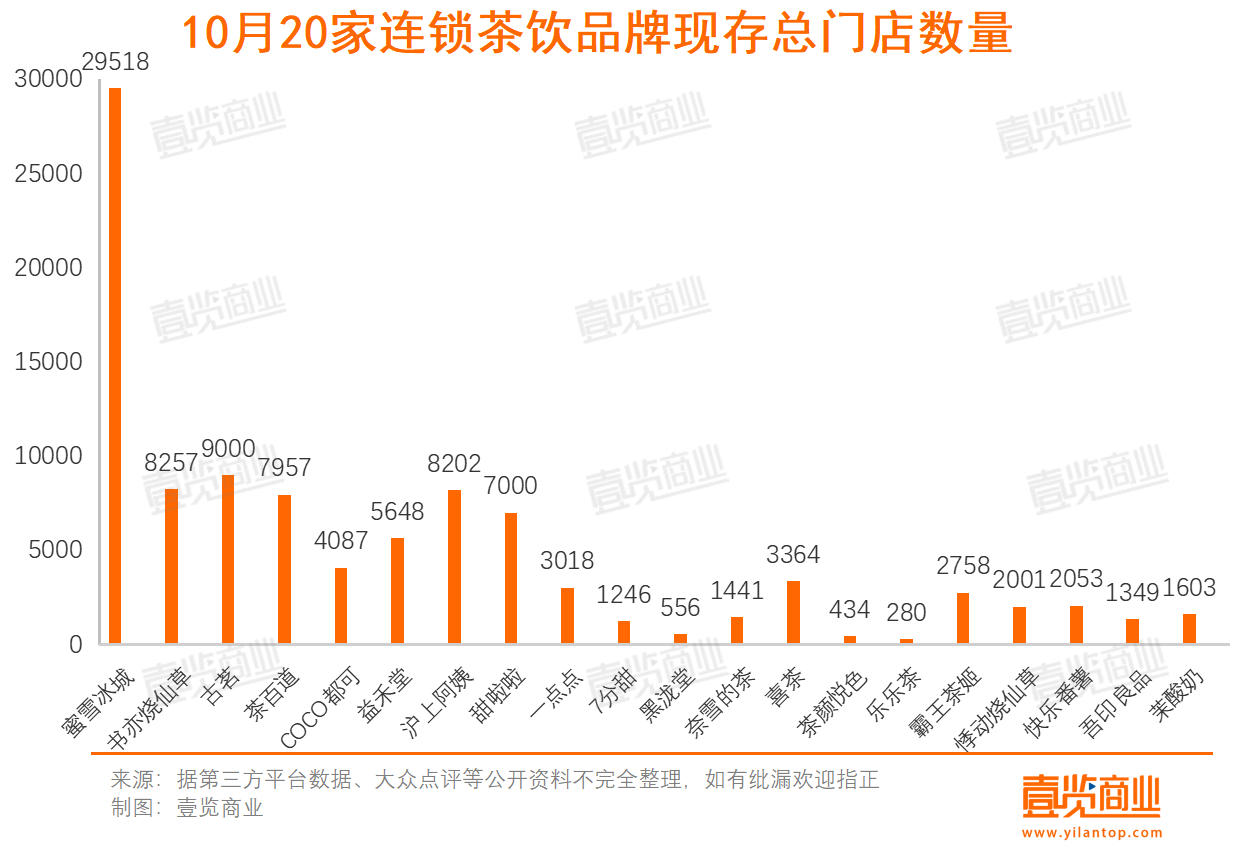 10月份,长期跟踪的国内20家连锁茶饮品牌共新开门店数量与上月相比减少962家。