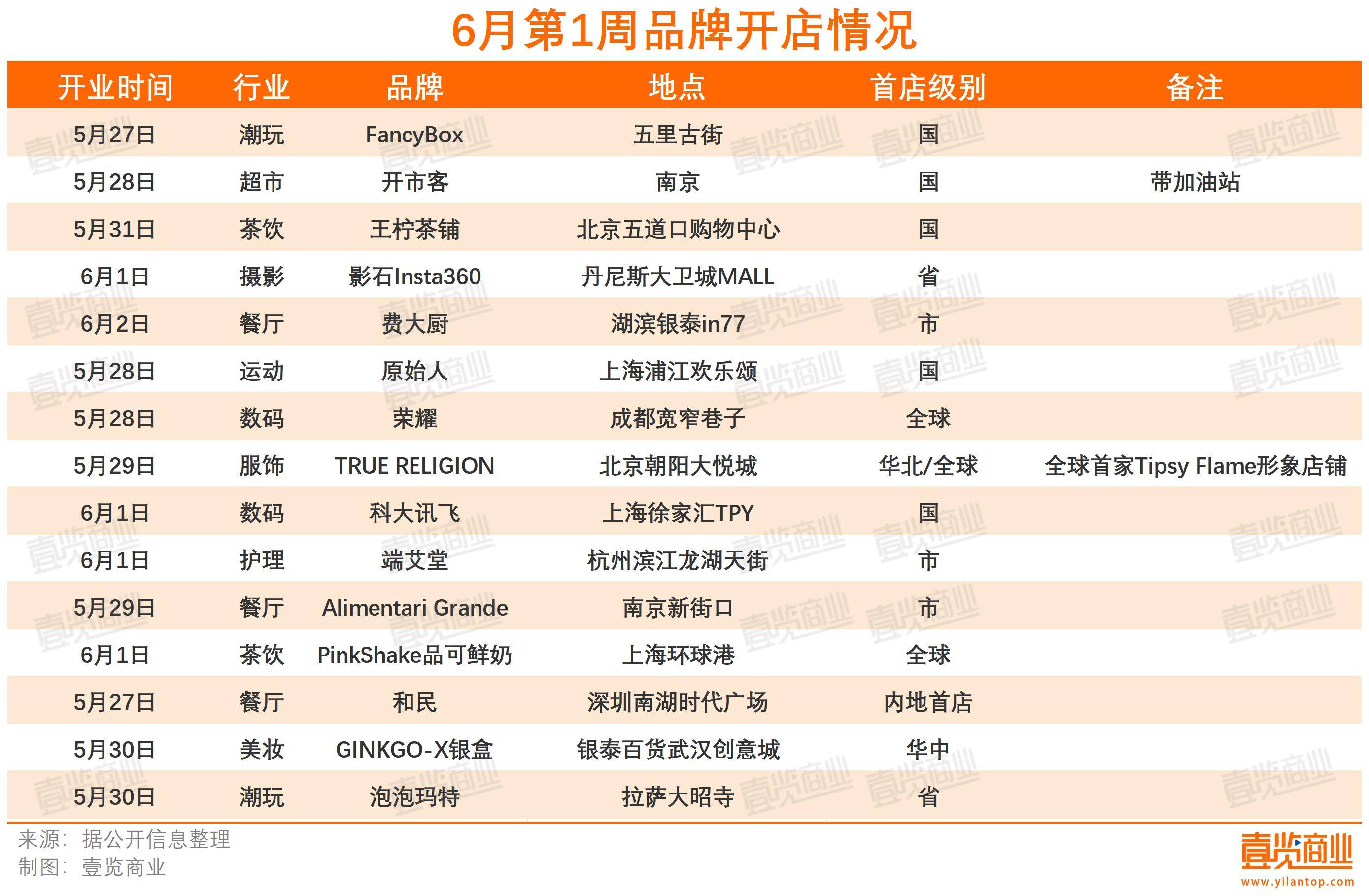 据壹览商业不完全统计,6月第1周,至少有个15品牌首店落地。其中,有6家全国首店,3家全球首店。