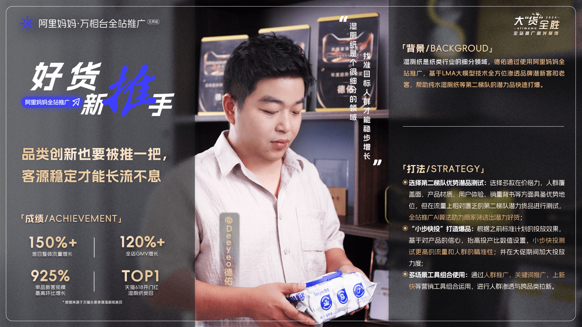 全站推广帮助个护品牌德佑引导成交占比超40%,全店人群资产新增超670w;扫地机器人品牌追觅通过该产品投放第二梯队货品,成功使某潜力宝贝销售额突破千万,带来新客规模增长超91%。;