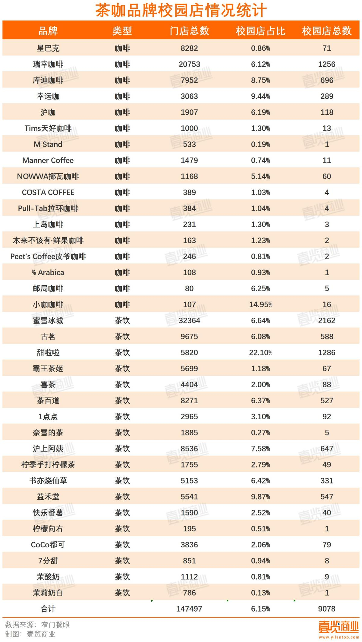 据壹览商业不完全统计,至少有35个茶咖品牌在全国范围内开出超9000家校园店,占门店总数的6.15%。