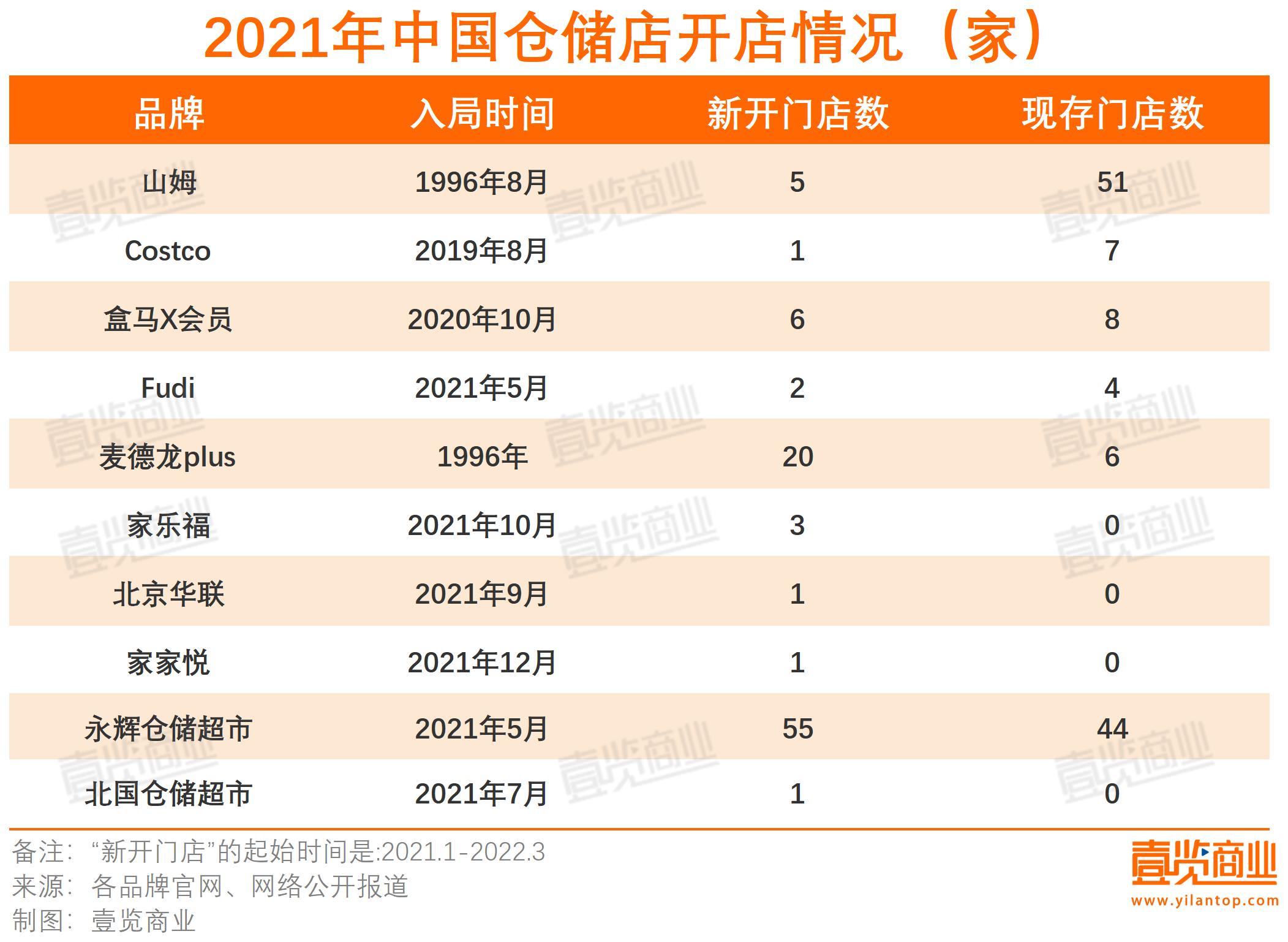 于是,仓储会员店的第二波“热潮”兴起,并在2021年迎来大爆发。这一年,除山姆、Costco等外资企业加速扩张外,包括超市、Fudi、家家悦、等多家本土企业也纷纷入局。据不完全统计,从2021年到2022年3月底,全国新开业仓储店超过100家。