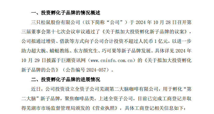 3月3日,三只松鼠发布公告称,公司投资设立全资子公司芜湖第二大脑有限公司,用于孵化“第二大脑”新子品牌,聚焦品类。该全资子公司已完成工商登记并取得营业执照,注册资本500万元。
