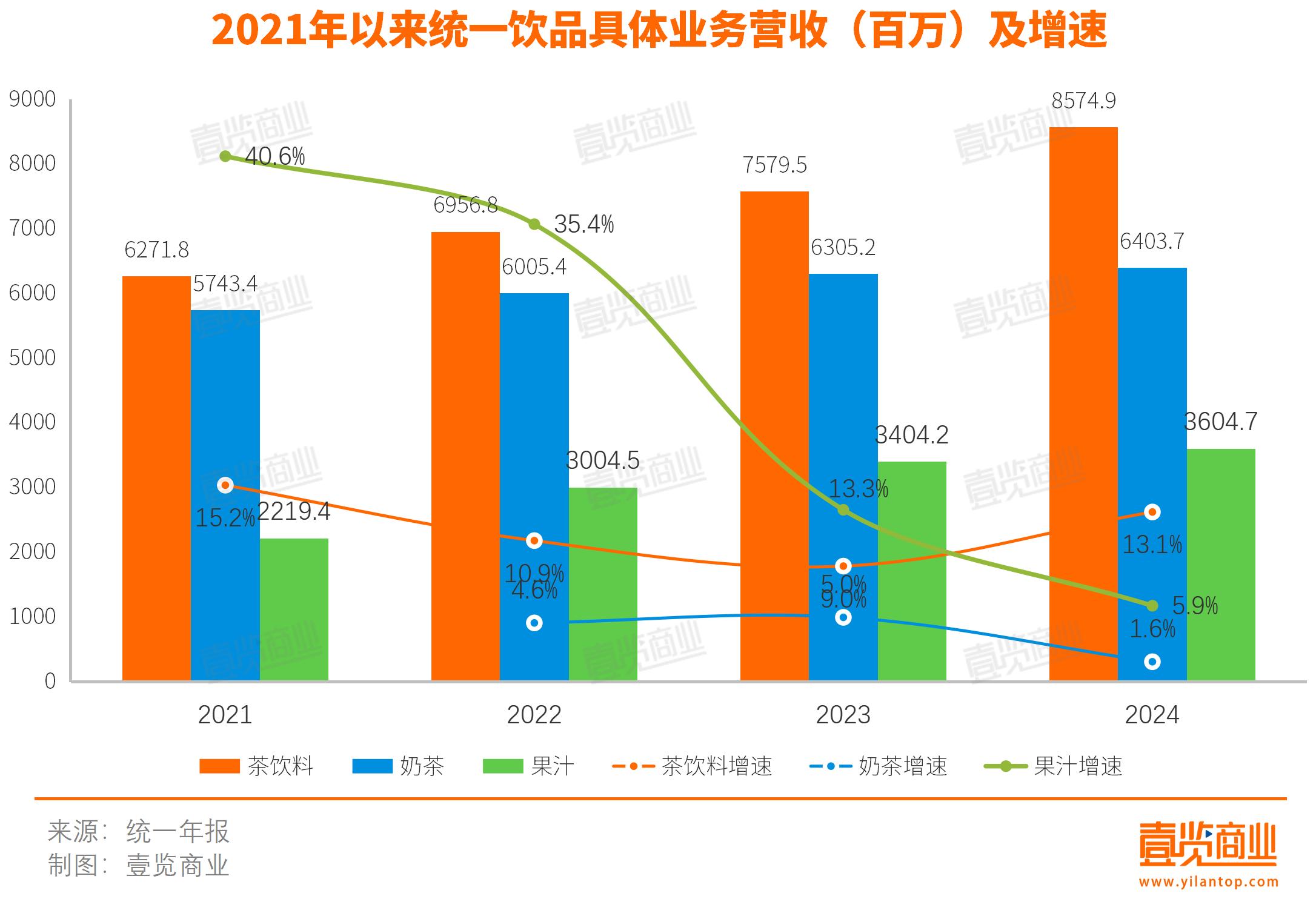 具体看,统一的饮品业务主要包括了茶饮料、果汁、奶茶、、包装水等产品。其中,茶饮料是其最大的营收来源。2024年,统一茶饮料收入85.75亿元,占饮品业务总收入的44.57%,以13.13%的增速领跑饮料业务,这也是该业务连续4年增长。