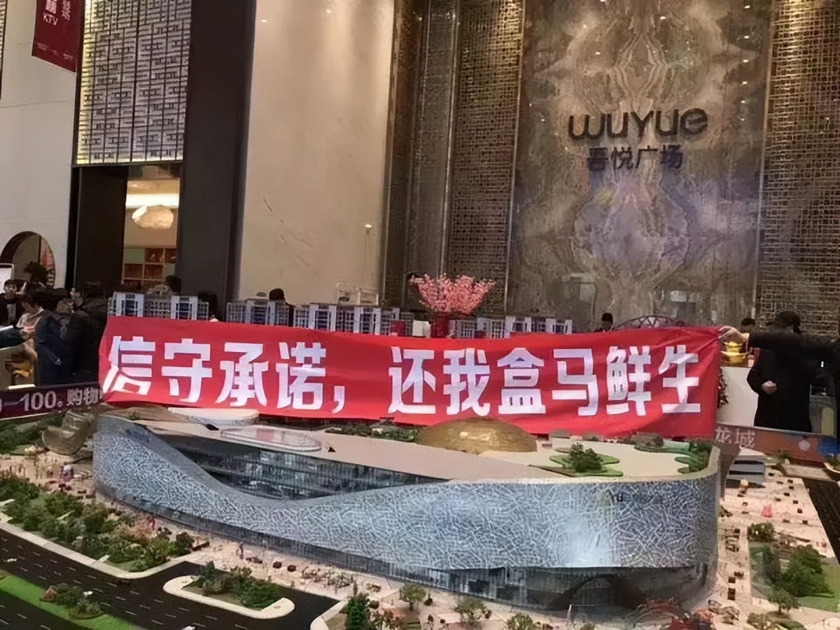 一常州楼盘在发售时,在各大繁华地段支起了巨幅广告牌,以常州首家的盒马鲜生为噱头。但交房后,业主才发现承诺的盒马变成了另一家大型超市,气急败坏的90后业主们纷纷跑去售楼部举横幅。