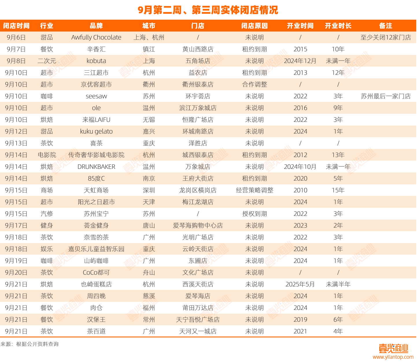 据壹览商业不完全统计,最近半个月,共26个品牌关闭了至少37家门店。