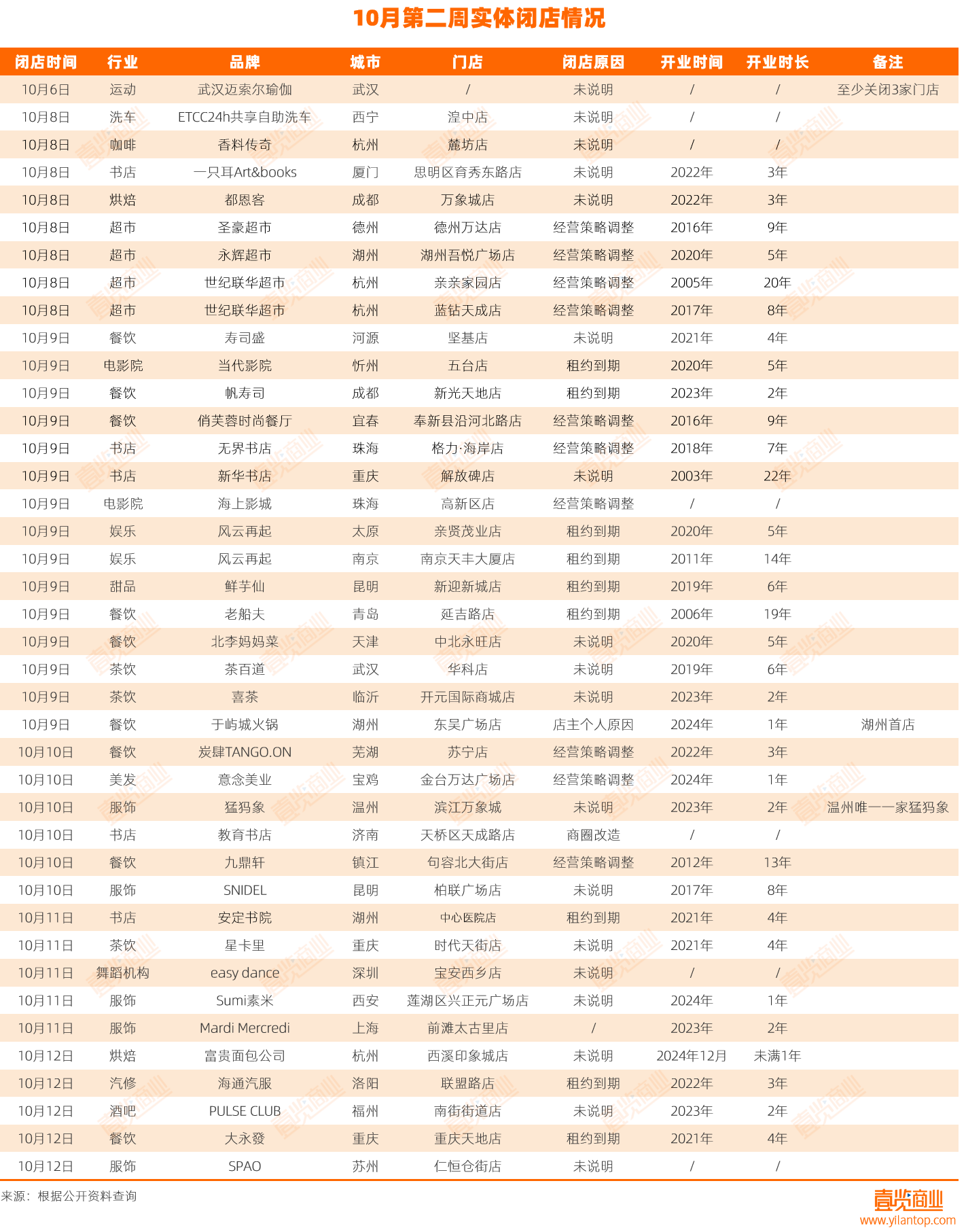 据壹览商业不完全统计,10月第二周,共38个品牌关闭了至少42家门店。