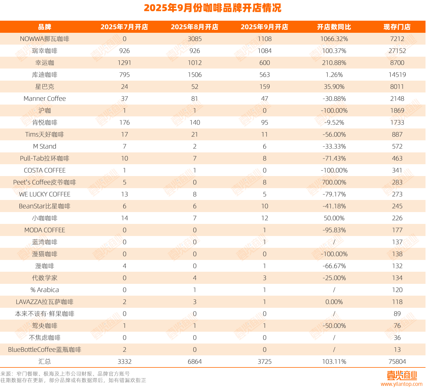 从个体动态看,部分品牌的拓店节奏出现明显变化。星巴克在本月新增159家门店,环比增长205.77%,显示出其重启积极扩张的策略;库迪咖啡则在9月新开563家门店,相比8月减少943家,降幅达62.61%,增速明显放缓;而幸运咖9月新增600家,相较前两个月上千家的规模,节奏略有收敛。