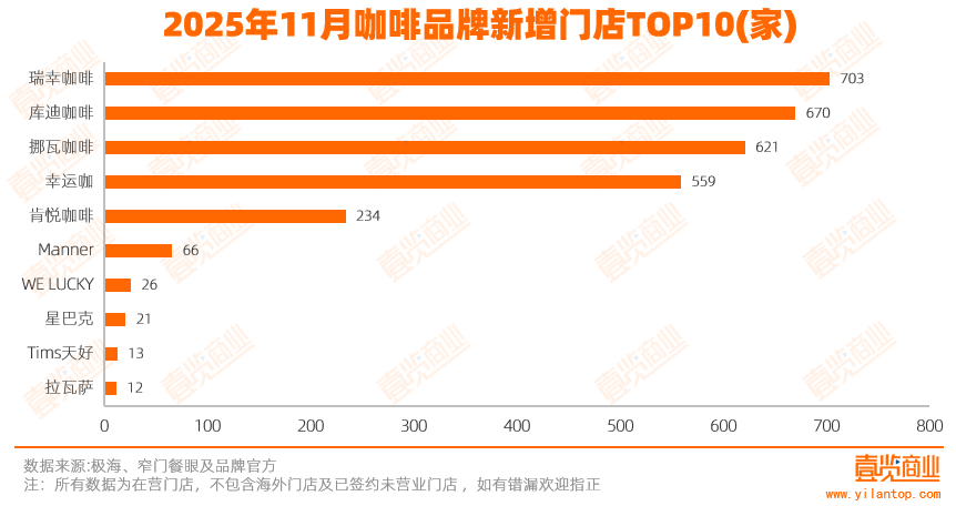 其中,瑞幸咖啡单月新增801家,占比超过四分之一,成为当月拓店主力;库迪咖啡和挪瓦咖啡紧随其后,分别新增670家和621家;幸运咖新增559家,肯悦咖啡新增234家。