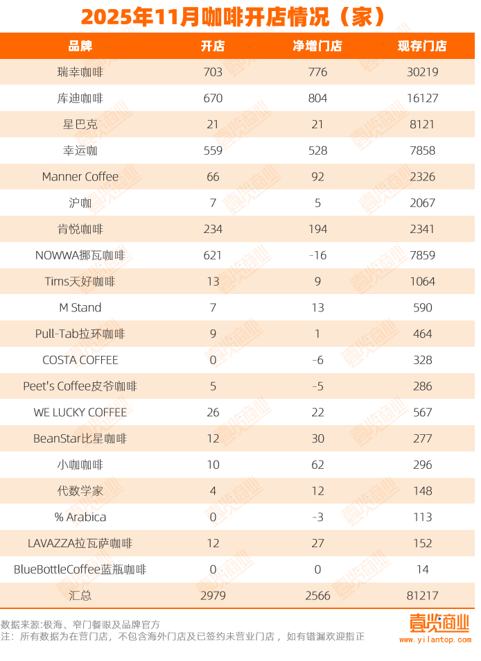 11月,壹览商业长期跟踪的20家连锁咖啡品牌共新开2979家门店,同比增长75.64%;总门店突破8.1万家,共计81217家,环比净增2566家,整体规模持续扩大。