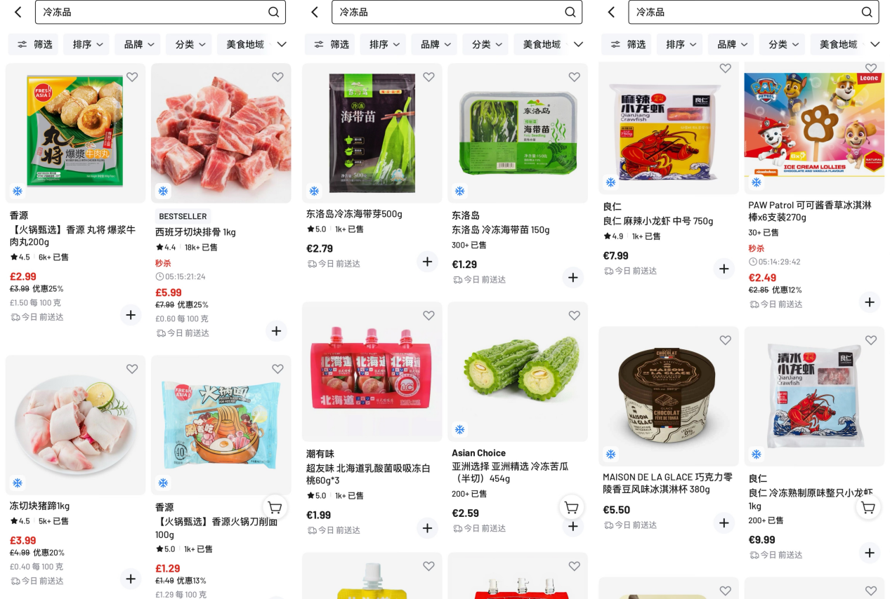 可以看到,定位英国伦敦能搜索出西班牙切块排骨、冻切块猪蹄等生鲜产品,但将同样的搜索词应用于荷兰或英国非伦敦地区,则只能搜索出冰淇淋、冻海带苗。